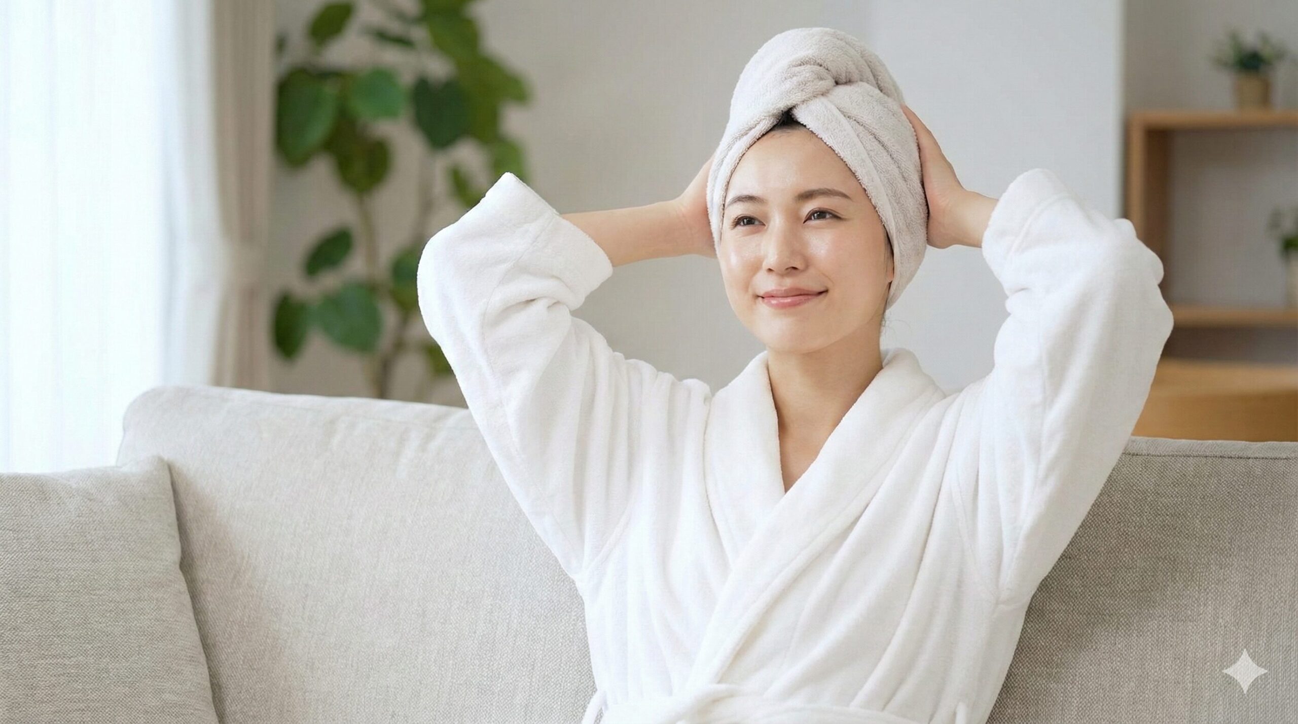 - 浴室を出る前に、バスタオルで「こすらず、優しく押さえるように」水気を拭き取る。