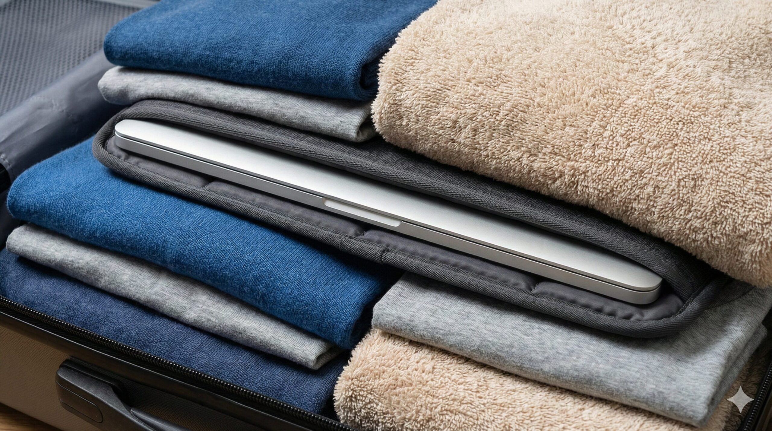 機内持ち込みにするとしても、空港までの移動や機内のハットラック(上の棚)への収納時など、振動や衝撃のリスクは常にあります。キャリーケース パソコン 大丈夫かな?と不安な方に実践してほしいのが「サンドイッチ・パッキング」です。これは、パソコンをキャリーケースの中央に配置し、その前後を厚手の衣類やタオルで挟み込む方法です。