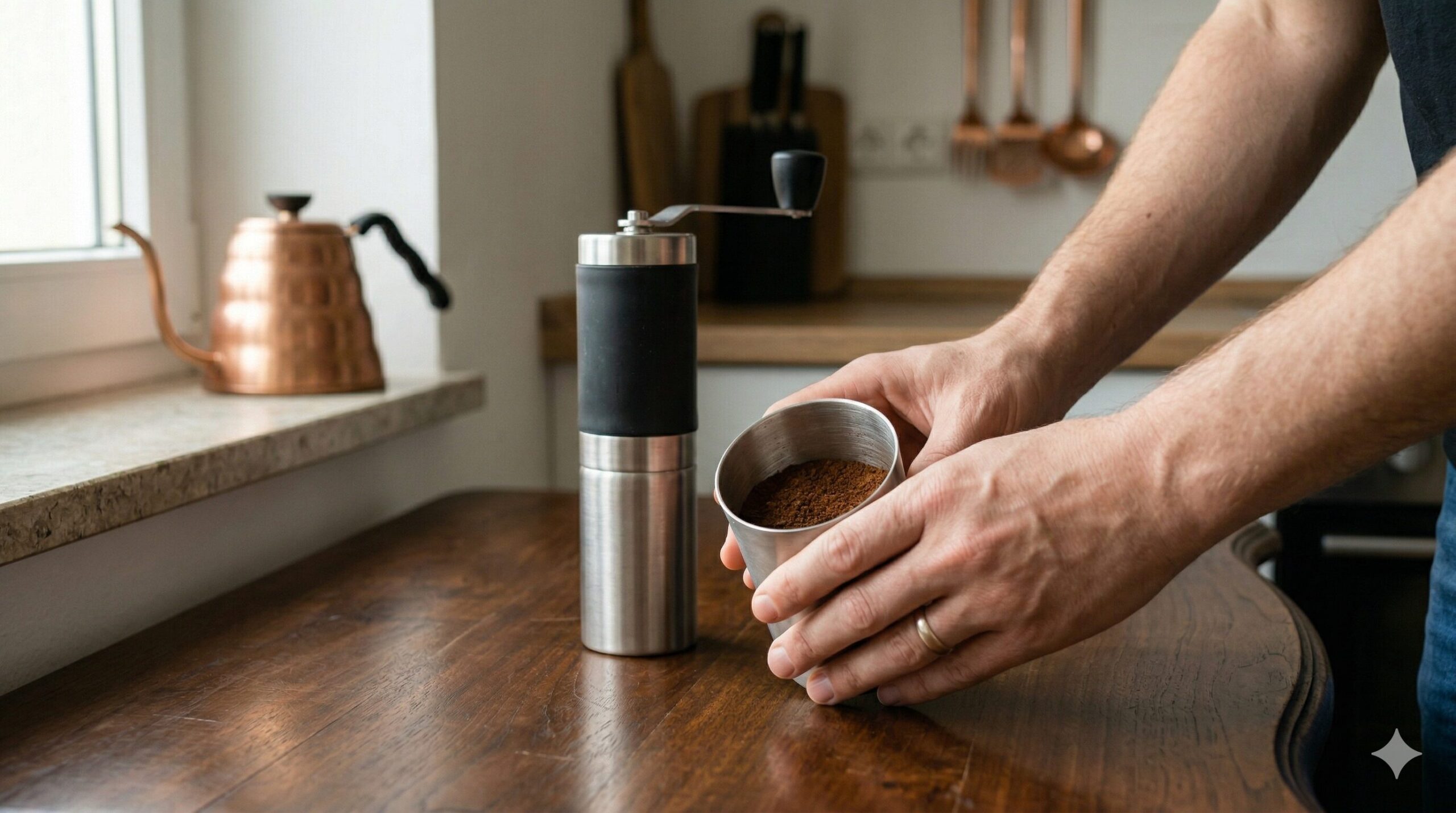 やり方は非常にシンプルで、ご家庭にあるティースプーンの柄の先や背中の部分をほんの少しだけ水で濡らし、挽く前のコーヒー豆を軽くかき混ぜるだけです。たったこれだけの手間で豆の表面に微量の水分が付着し、摩擦による静電気の発生を驚くほど抑え込むことができます。特別な道具を購入する必要がなく、今すぐキッチンで試せるため、手挽きの時間を劇的に快適にしてくれる素晴らしい対策です。