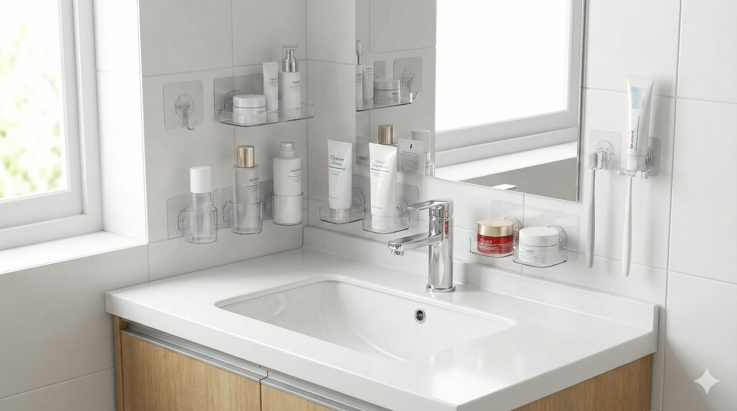 - 狭い賃貸の洗面台でもスキンケア用品を落ちずに浮かせる収納のコツ